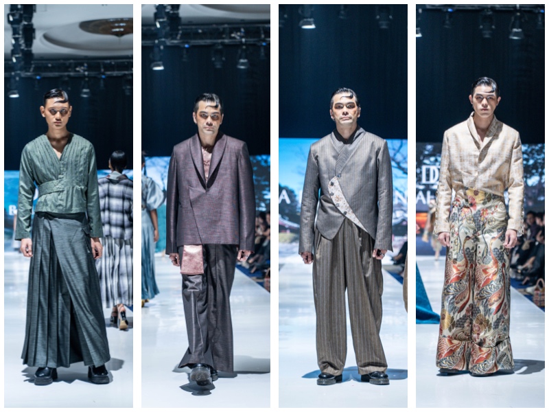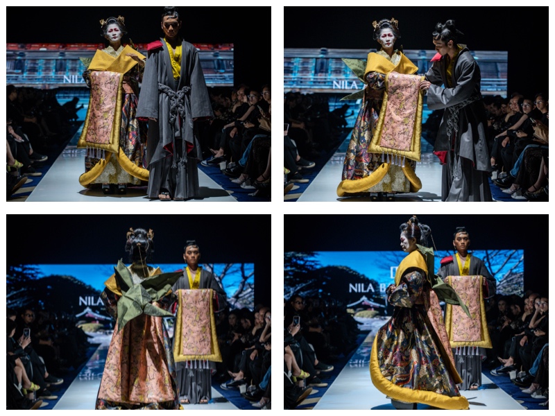 Figur seorang pria dan perempuan hadir di awal, membawa elemen-elemen yang merepresentasikan Jepang—bukan sebagai kostum, melainkan sebagai simbol. Kimono, lipatan origami, makramé, hingga kilau warna dan motif menyerupai lukisan hadir sebagai bahasa visual yang tenang namun tegas. Sebuah penghormatan bagi negeri yang membentuk cara pandang sang desainer.