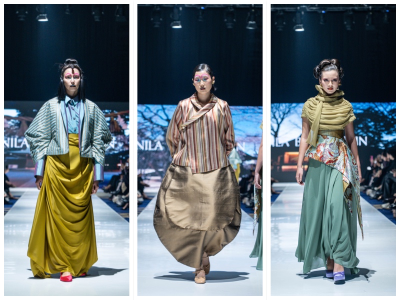 Eksplorasi siluet berlanjut pada rok gelembung berpotongan balon—avant-garde namun tetap elegan—sebagai penanda lain dari bahasa desain Nila. Maxi skirt dengan permainan drapery hadir dalam berbagai pendekatan styling: dipadukan dengan obi, layer bertumpuk, pleats, hingga kantung asimetris.