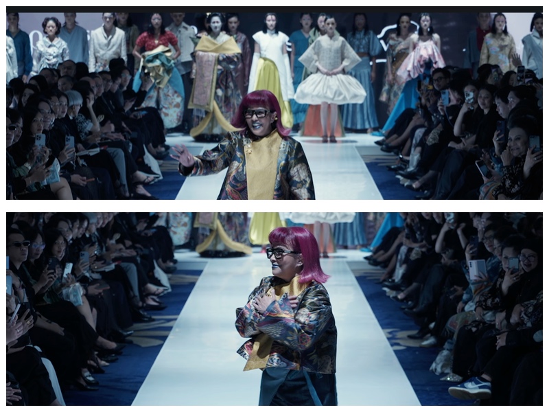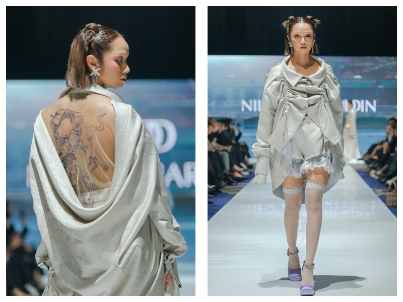 Salah satu momen berkesan hadir melalui kolaborasi dengan seniman lukis Zita Nuella. Sebuah gaun dengan lengan exaggerated tampil sebagai kanvas berjalan, mempertemukan tekstil dan seni lukis dalam satu wujud. Aktris senior Meriam Bellina turut berjalan, mengenakan kimono crop dengan detail origami dan aksen pita di bagian belakang pinggang, dipadukan dengan rok drapery berwarna iridescent—warna yang berubah mengikuti cahaya, memberi efek hidup dan dinamis.