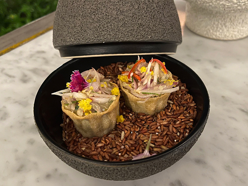 dan savoury. Lampung beef tartare disajikan di atas mangkok yang diisi