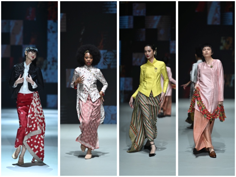 Paduan antara parka linen dengan sarung tenun Bali, hingga kebaya putih berkerah tinggi yang dipasangkan dengan hareem pants, menciptakan busana tropis modern yang mengharmonisasi tradisi dan estetika global.