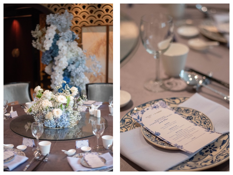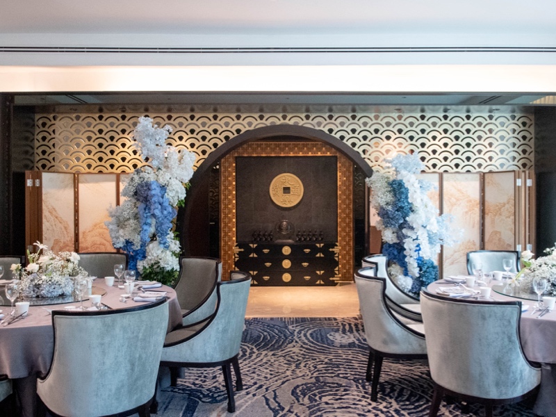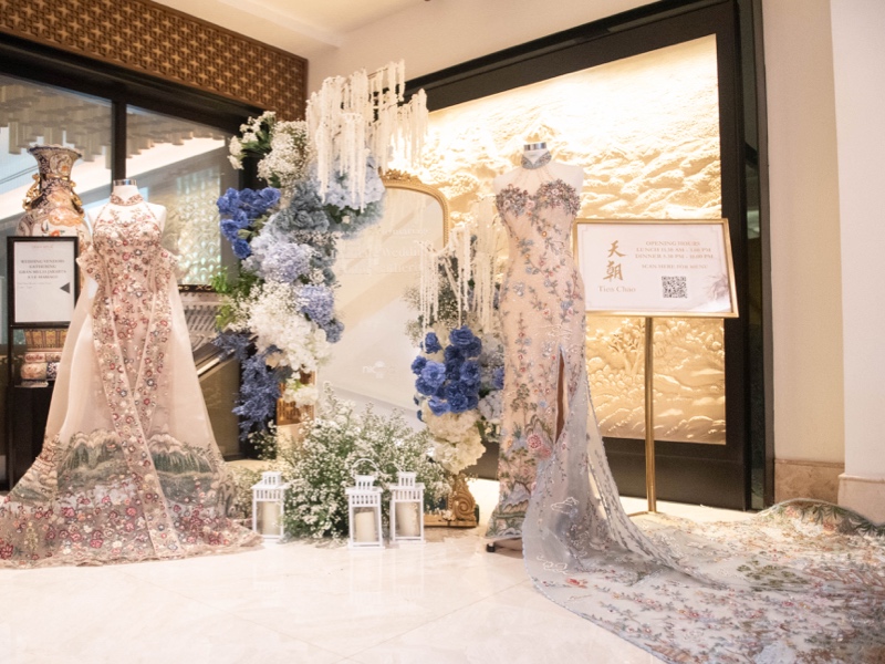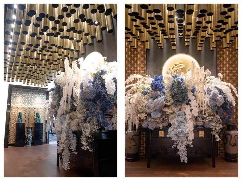 Sebelum memasuki restoran, tamu disambut oleh instalasi welcome design dari Niccatelier dalam palet biru-putih. Perpaduan cermin vertikal dan rangkaian bunga memberi impresi lembut namun modern. Dua manekin berbalut cheongsam rancangan Alethea Sposa mempermanis area tersebut, menjadikannya spot favorit untuk berfoto.
