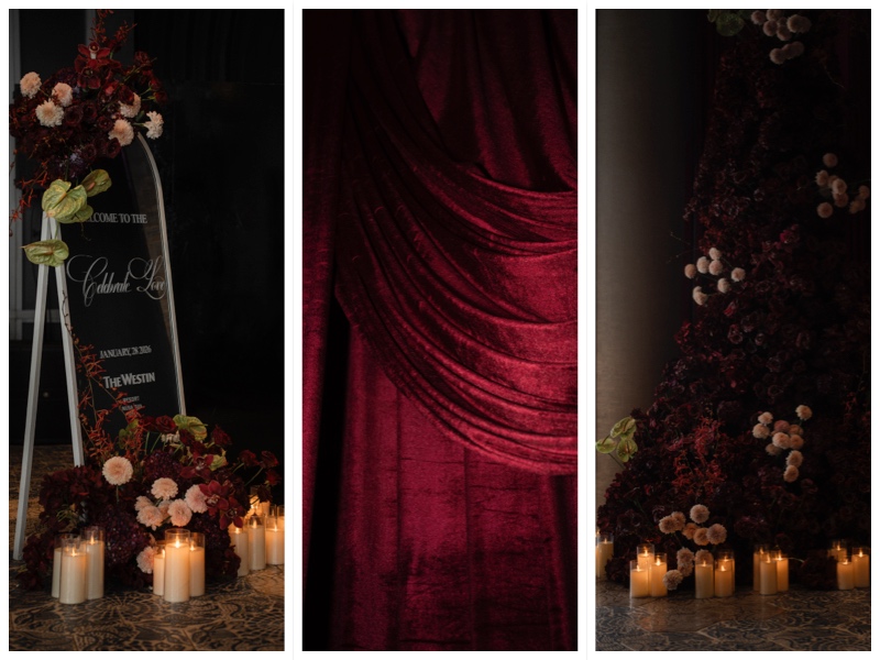 Long table bernuansa timeless romance ditata oleh Classy Decor dengan dominasi maroon yang elegan. Senada dengan sudut photo booth berbalut drapery velvet serta floral arrangement berpalet blush dengan sentuhan hijau yang memberi kelembutan visual dalam merayakan cinta.
