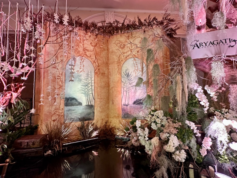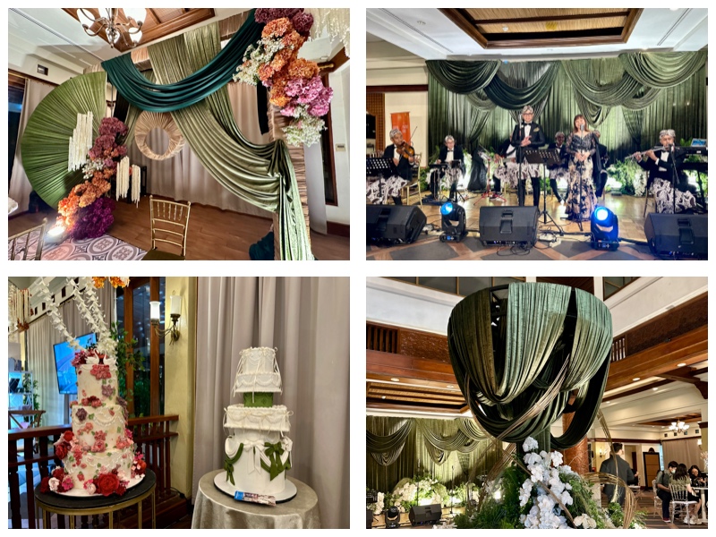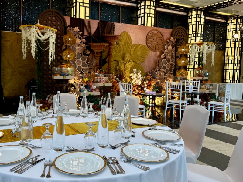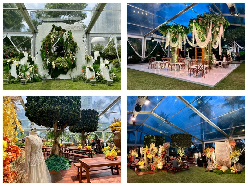Bergeser ke area semi-outdoor, Ceria Room menawarkan suasana yang lebih hangat dan kental nuansa Indonesia. Dominasi warna hijau berpadu dengan eksplorasi drapery, instalasi string, serta reinterpretasi elemen budaya seperti gunungan dan janur—menciptakan bahasa visual yang menjembatani warisan tradisi dengan kemewahan urban.