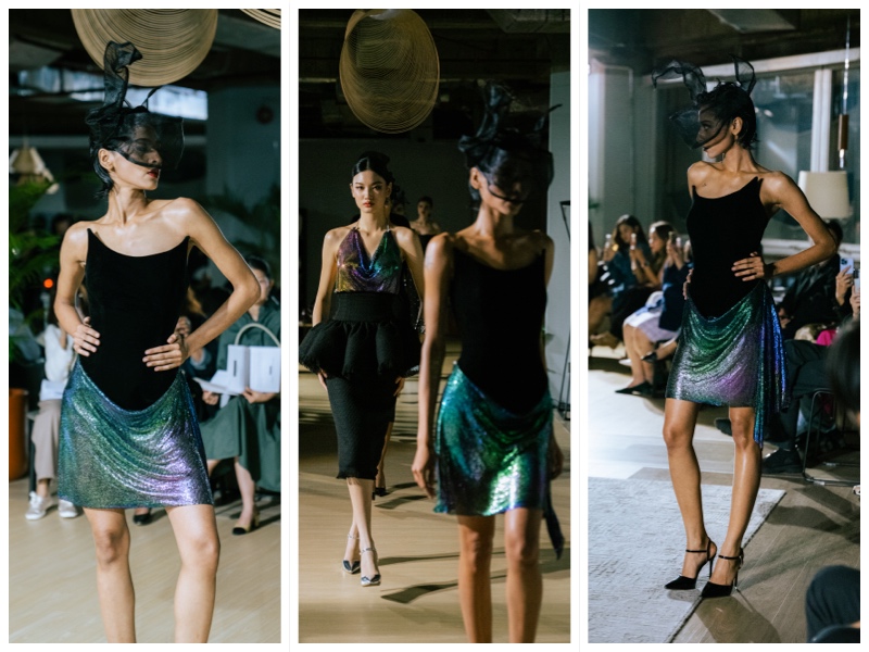 Ragam siluet fit-and-flare turut memperkaya koleksi, mulai dari duyung, pensil, Dior’s New Look, hingga skirt bertingkat. Permainan material pun terasa eklektik nan apik, dari crinoline, jacquarde, taffeta, organza, satin, hingga material modern seperti lame, acetate, chainmail, lateks dengan sentuhan iridescent melalui aplikasi kristal, payet, fringe, dan beading. Beberapa tampilan dilengkapi fascinator karya Hummingbird Road, menambah dramatisasi.