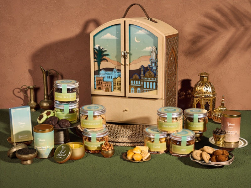 Semangat berbagi juga diciptakan melalui koleksi Hampers Idul Fitri yang didesain sebagai hadiah elegan untuk keluarga, kerabat, atau kolega. Setiap hampers menampilkan diorama pemandangan gurun dengan kubah dan menara, dibalut palet teal, krem, dan biru tua yang menenangkan.
