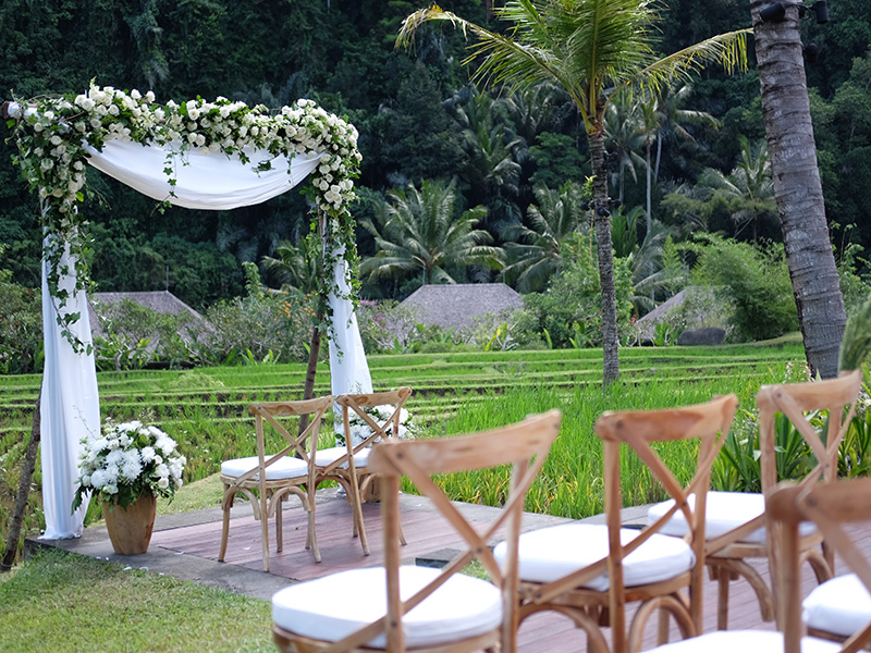 Pasangan dapat memilih dari berbagai lokasi spektakuler di dalam resor, termasuk tepi Sungai Ayung yang tenang, Rice Terrace Deck yang ikonik, atau Temple Lawn, dengan latar belakang upacara menampilkan pura berusia ratusan tahun. Setiap lokasi di Mandapa menawarkan suasana damai yang mencerminkan ketenangan spiritual Ubud, jantung budaya Bali.